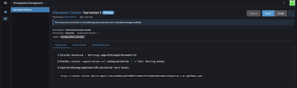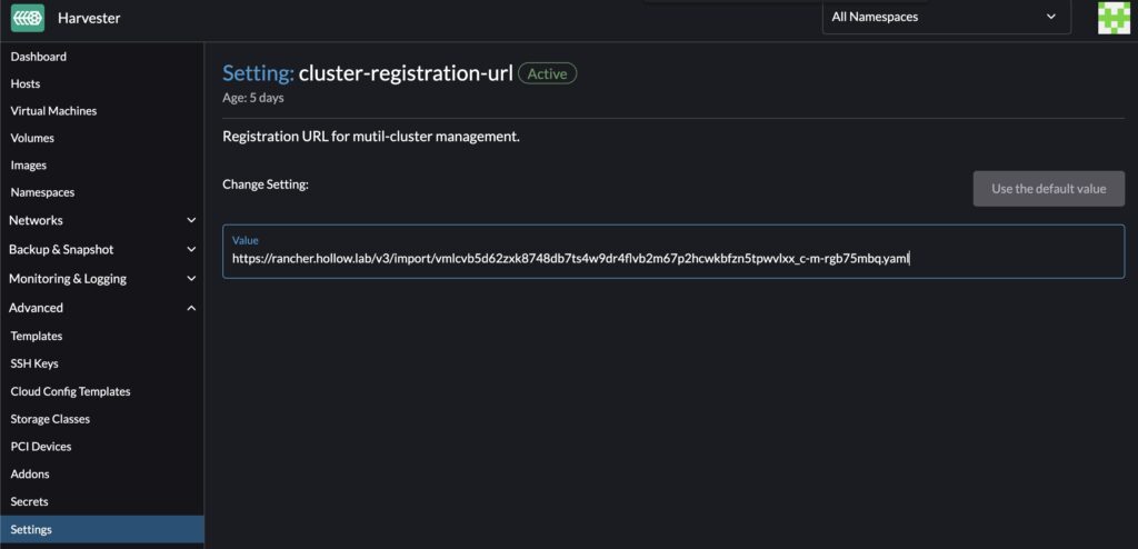 The instructions have you log in to your Harvester cluster and go to the Advanced Settings screen, and update the cluster-registration-url value to the string specified. I’ve copied the string from my Rancher server settings and pasted it in my Harvester cluster-registration-url.