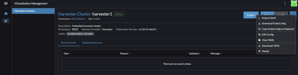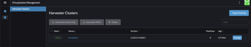 When you’ve completed that step, you can go back to your Rancher server. You’ll notice that the Harvester cluster shows up now and you can now mange the Harvester Kubernetes cluster from the Rancher server.