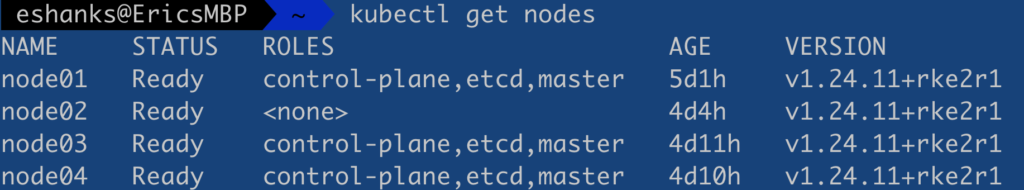 Once I’ve completed these tasks I can run kubectl commands on laptop against my Kubernetes cluster. To show that its working, I’ve listed the Kubernetes Nodes.
