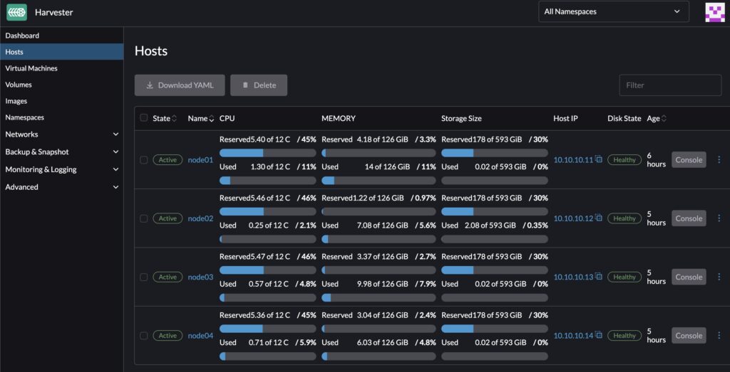 When you access the Dashboard, you’ll see information pertaining to Hosts, VMs, storage, and other resources. The below screenshot shows the four hosts I’ve added to my Harvester cluster.