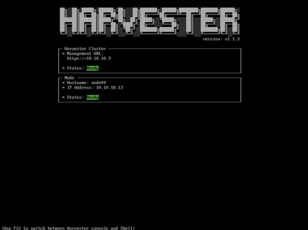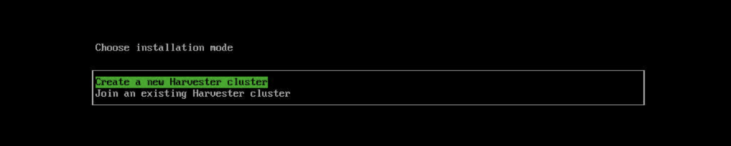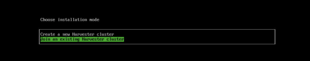 To add the additional nodes, you can boot them from the same iso file. This time when you’re presented with the choice, choose “join an existing Harvester cluster”. The rest of the screens will be very similar to what you did when setting up the first host.