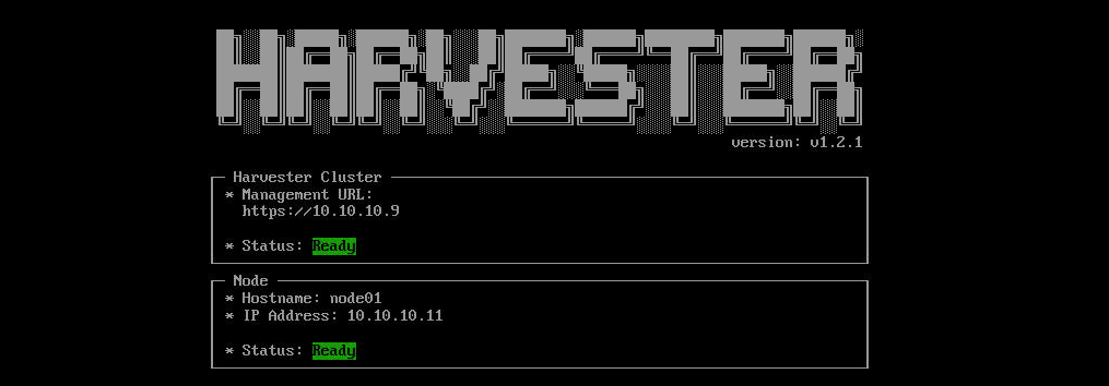 After verifying the settings, begin the installation. Just like before when the installation is done the Harvester screen should appear and show the management cluster and node in a ready status.