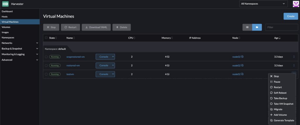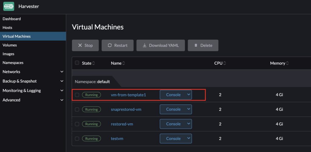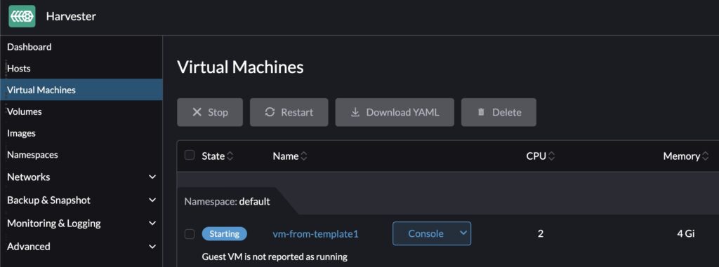 As your VM is being created, you’ll see some information in your " Virtual Machine" list from the Harvester UI.