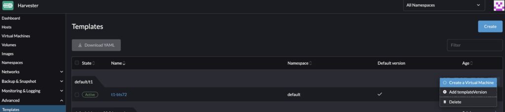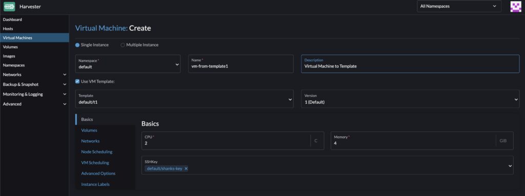 Once our snapshot has completed, we can use that snapshot to deploy a new virtual machine with all our virtual machine settings intact. Go to the " Templates" menu under the Advanced settings in the Harvester UI. Click the “Create a Virtual Machine” from the options menu.