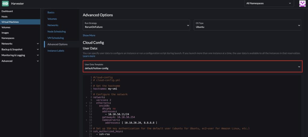 Creating virtual machines from a template is a pretty critical component of virtual infrastructure these days. Harvester, in conjunction with snapshots and cloud-init configs gives us the capability to create new VMs from a copy of an operating system installation and customize it so that we can quickly spin up new VMs in a reasonable amount of time.