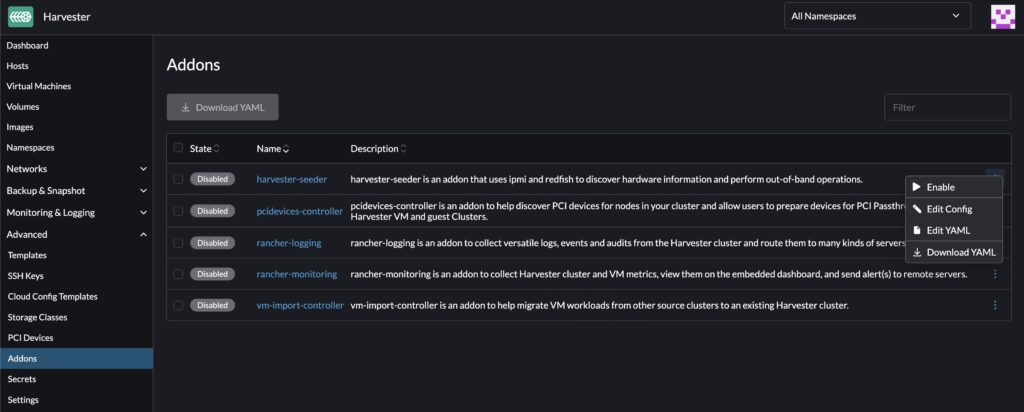 Seeder is an open source tool used to the the IPMI integration with Harvester. To install Seeder, go to the Advanced settings page in the Harvester UI and go to Addons. In the Addons page look for the harvester-seeder addon, and click the hyperlink, or select the kabob menu and choose “Enable”.