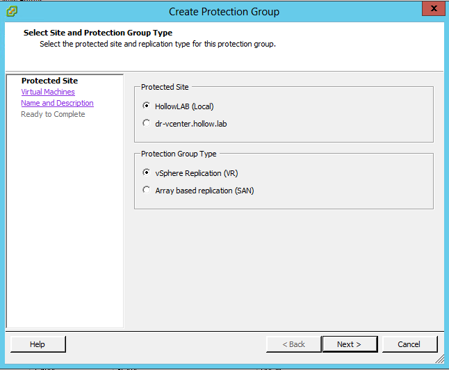 Select which site is the protected site and what kind of replication is being used. NOTE: if you are using SAN replication, an entire datastore must be selected for the protection group instead of a single VM. This is important to note when making your design considerations.