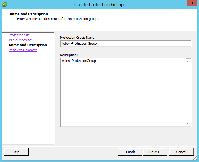 Name the Protection group and give it a description. It would be good to name this with the type of application involved such as Oracle Databases, or Web Servers, etc.