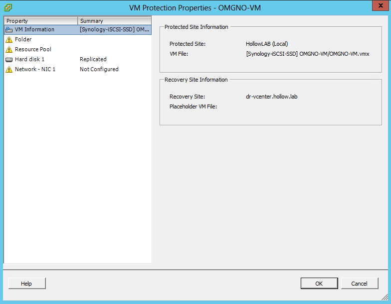 Once done, you may have a warning that the status is not configured. This may happen if you haven’t setup all of the mappings in the site configuration. You can click on the entire protection group or the individual VMs and select “Configure Protection”.
