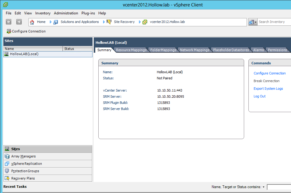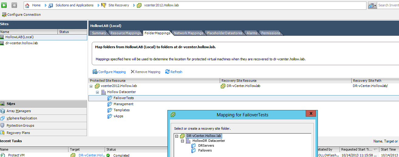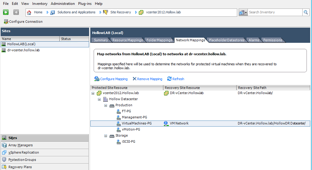 Now you’ll see that both vCenter servers are listed under sites. Next you want to configure mappings. Mappings are necessary for the recovery site vCenter to know what to do with the virtual machines when a failover occurs. For instance there is a folder mapping that shows where to put VMs when they are failed over.