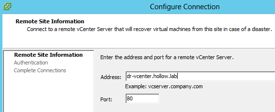 Enter the recovery site information. This is the server running vCenter at the DR site.