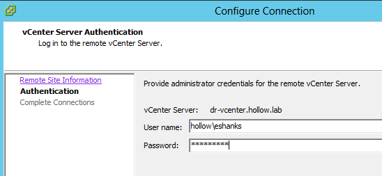Make sure you have login credentials for the DR site’s vCenter server. Enter your login info.