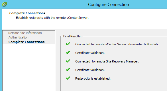 The first requirement is to setup a connection between the protected site (production site) and the recovery site (disaster site). Click the “configure connection” link.