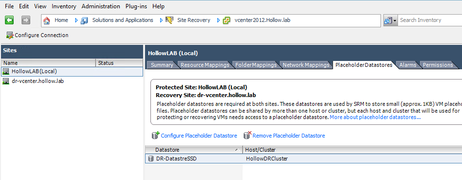 Lastly, you’ll need to setup a placeholder datastore. This is the datastore where the VM lives. This is only the .vmx file and not the .vmdk files (or virtual disks that are replicated).