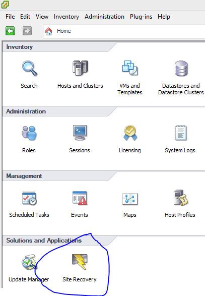 Once the SRM servers, vCenter Servers, SSO etc are all installed, you can finally begin the configuration. In the vSphere client go to the SRM icon to get started.