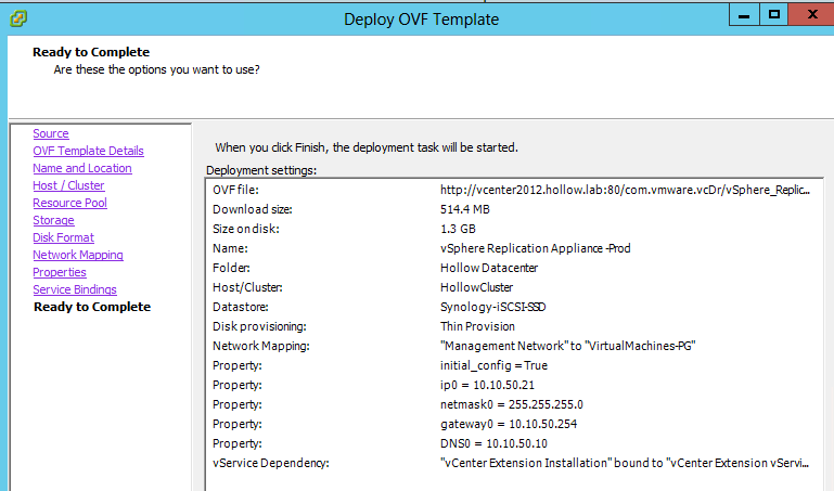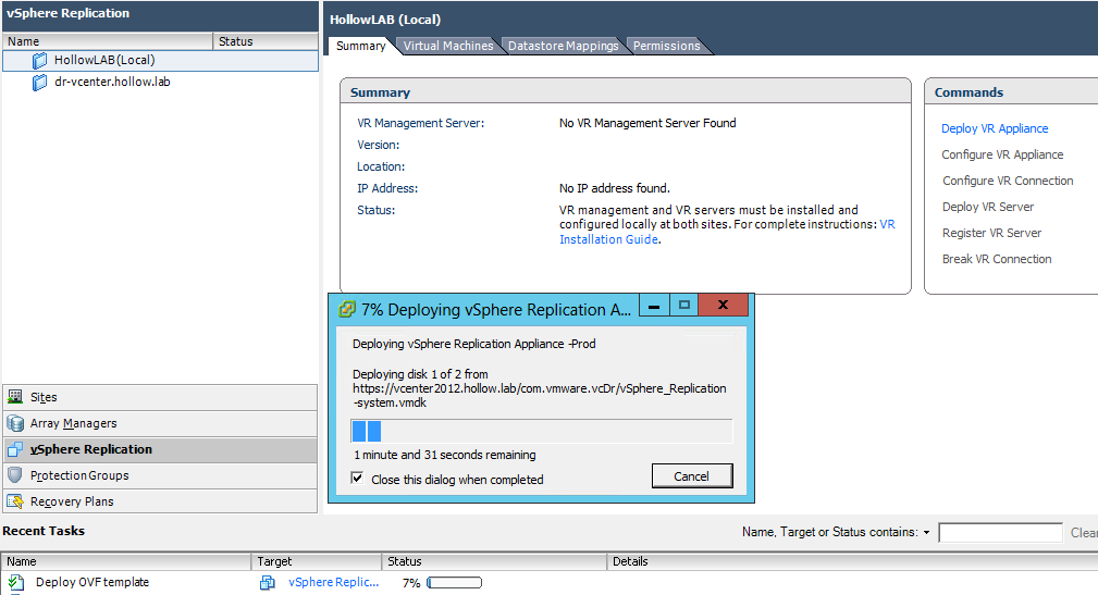 Wait for the replication appiance to deploy the disks and register with vCenter.