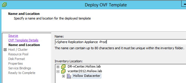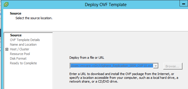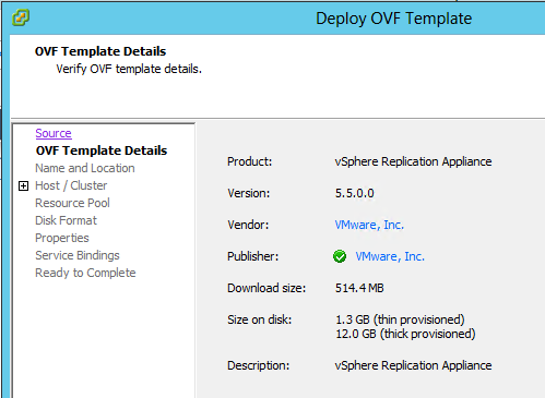 If you plan to use VMware Replication to replicate your VMs, you’ll need to deploy a VR Appliance at each site. Click the “Deploy VR Appliance” link under the VMware replication tab.